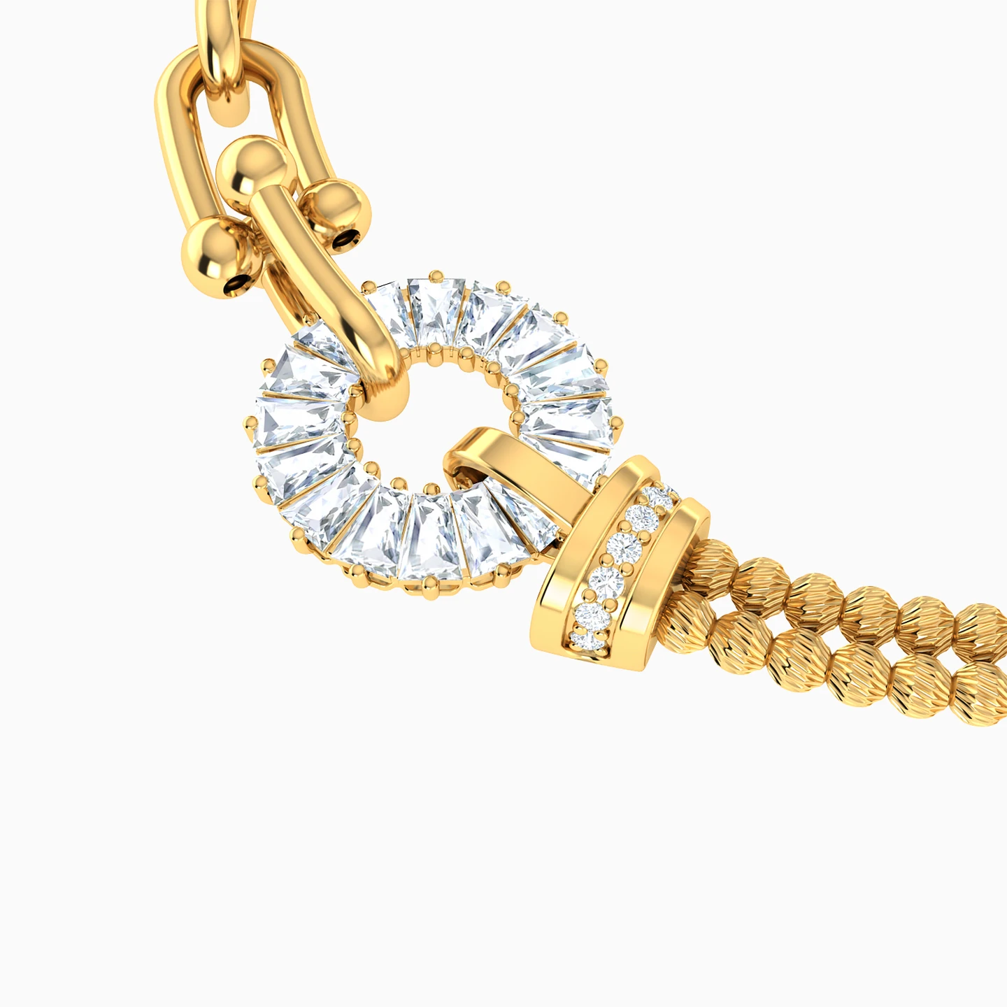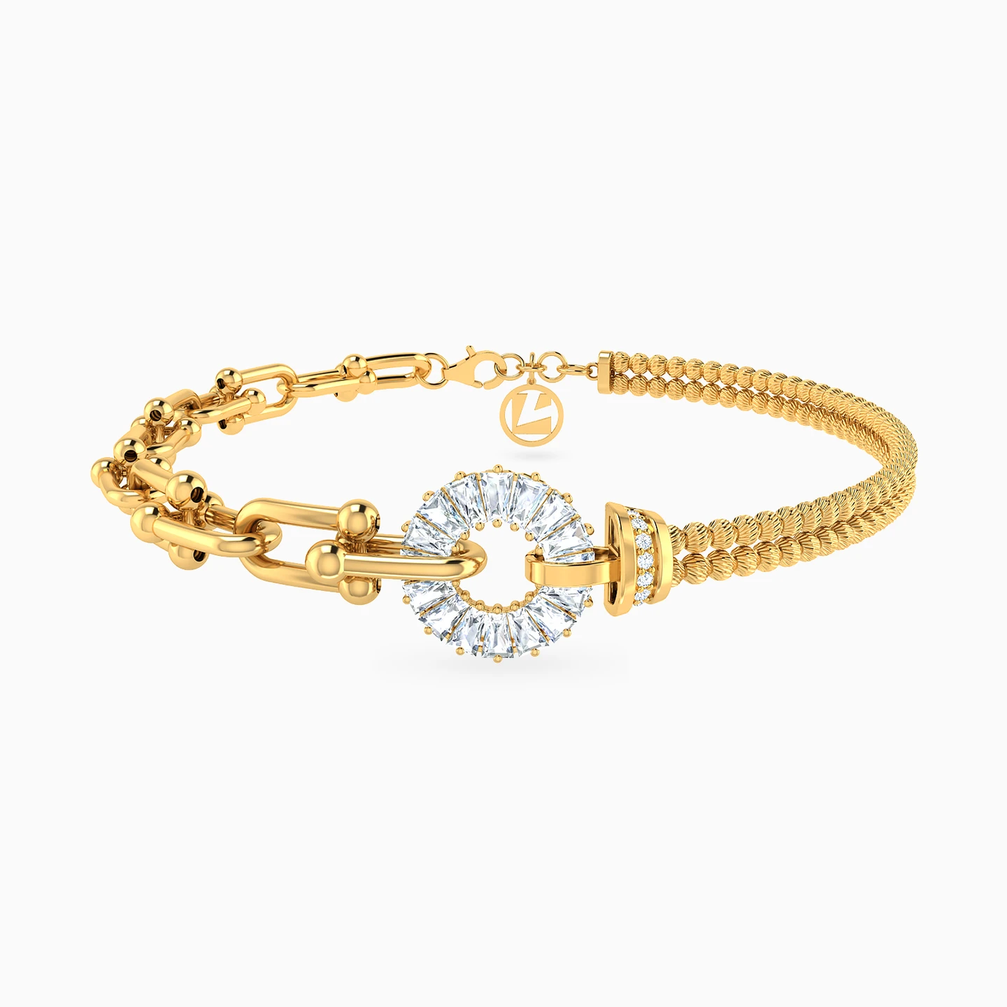 A stunning 18-karat yellow gold chain bracelet from L'azurde Gold showcasing a delightful fusion of texture and sparkle that's bound to add a tropical twist to your style! On one side, the U-shaped paper clip links, connected in opposite directions, create a contemporary and playful design, while on the other side, two rows of beautifully textured gold beads add an elegant touch. At the center, the pièce de résistance – a dazzling circular frame formed by beautifully shaped cubic zirconia stones set on prongs, reminiscent of a pineapple slice is accented on one side by a loop made of round-shaped cubic zirconia. It's a bracelet that seamlessly blends sophistication with a sense of fun, making a unique and stylish statement!