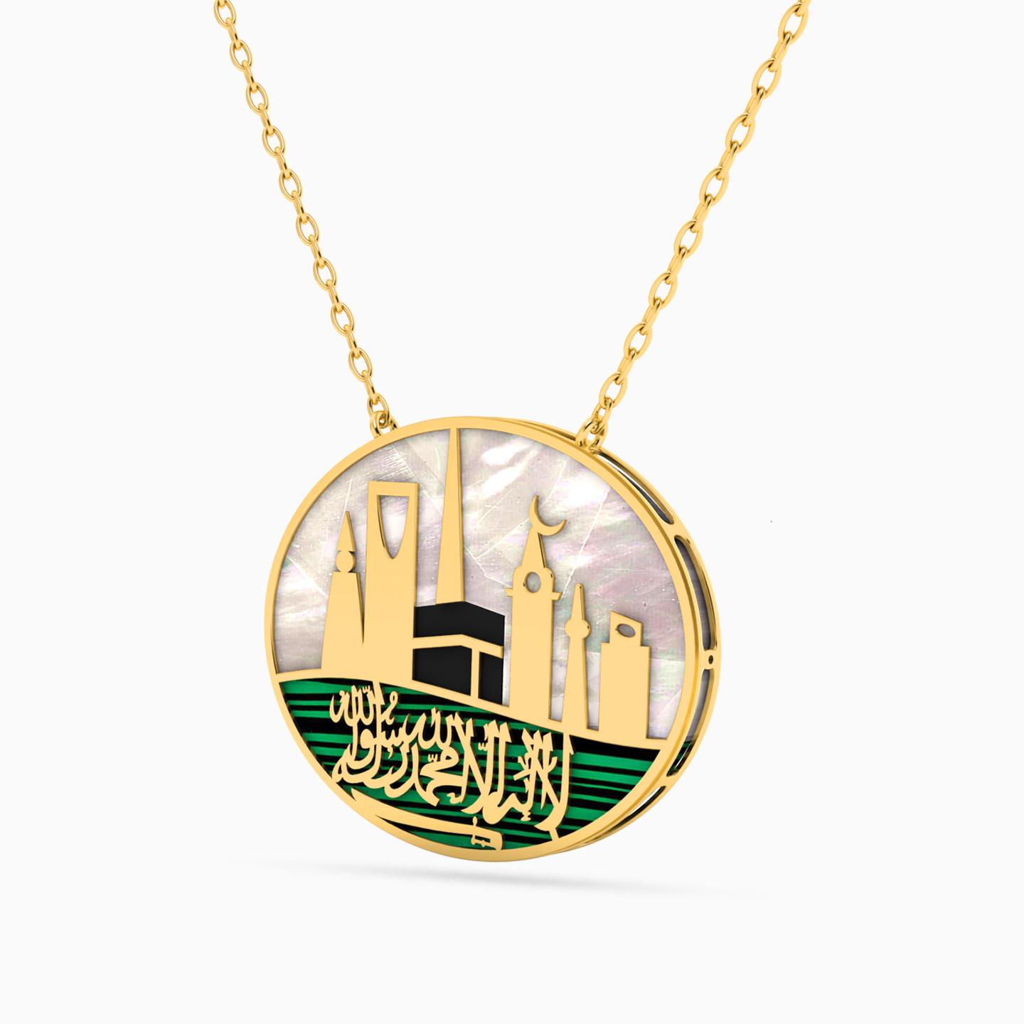 Carry the historic and modern landmarks of your country everywhere you go with this necklace from L'azurde Instyle. It features the Holy Kaaba along with notable buildings and structures carved in mother of pearl and green stone and set in 18-karat yellow gold. This piece can be worn as an accessory or saved as a keepsake.