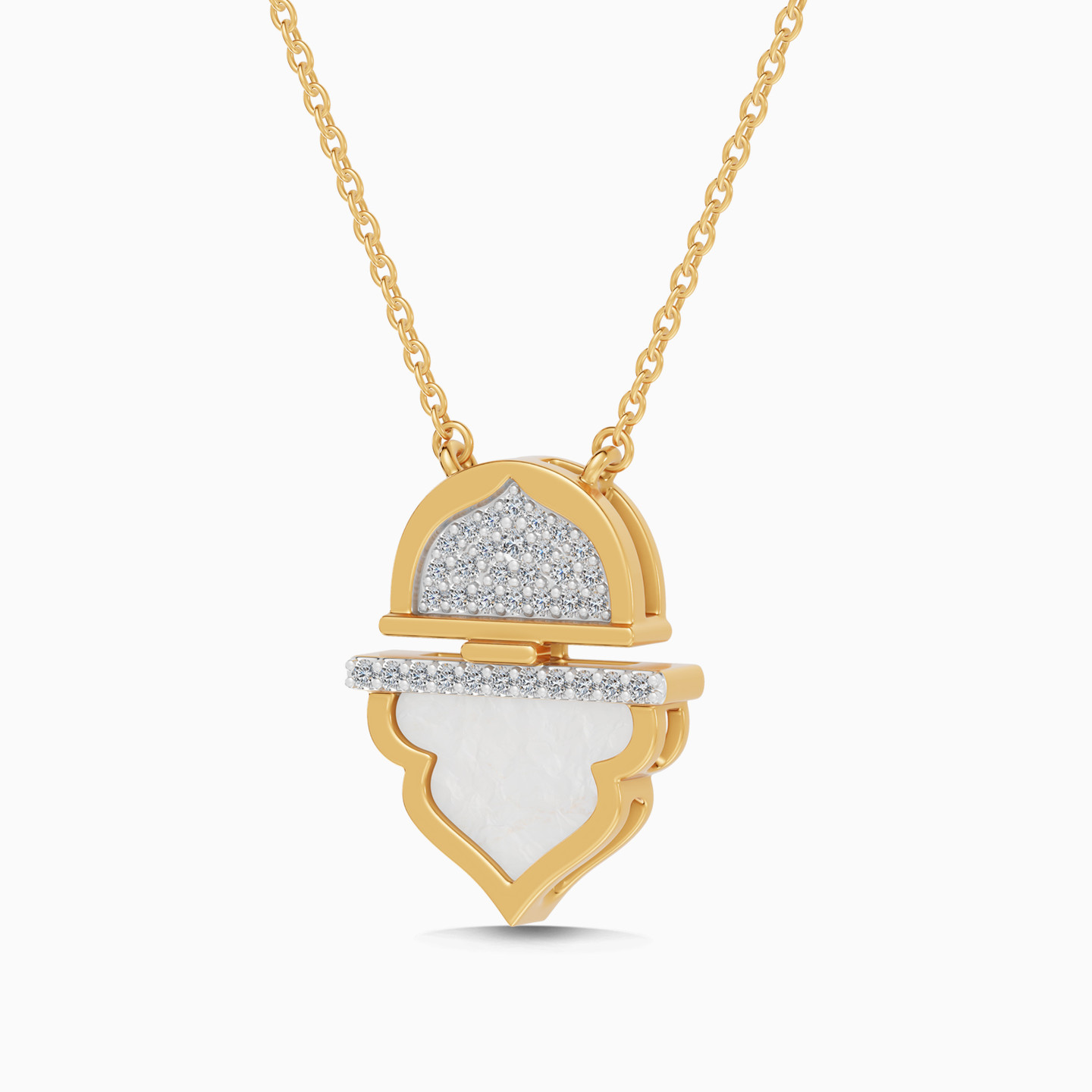 For the spirit of Ramadan, Geometry meets heritage in a composed expression of light. This Lazurde Diamonds necklace is crafted in yellow gold, where an oriental arch frames a luminous mother of pearl stone, seamlessly connected to a diamond-studded half circle that adds a bold architectural edge. The contrast between softness and structure reflects confidence shaped by refined taste. A distinctive piece to gift with intention or to treasure as a timeless investment in elegant design.