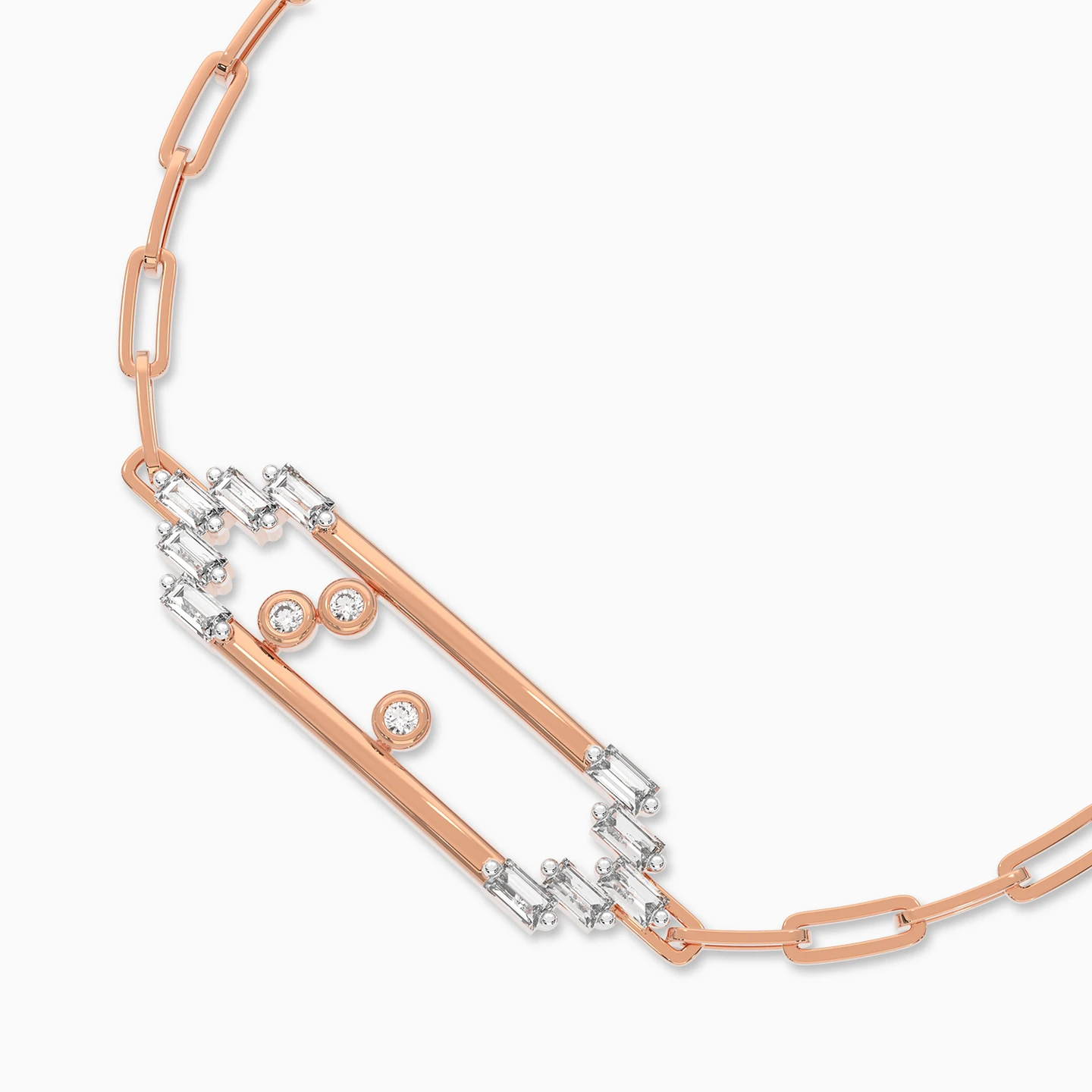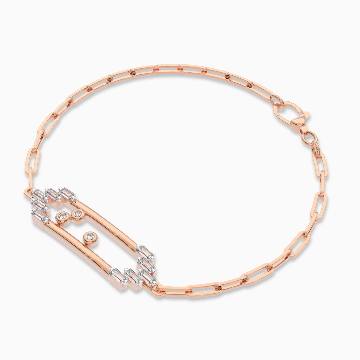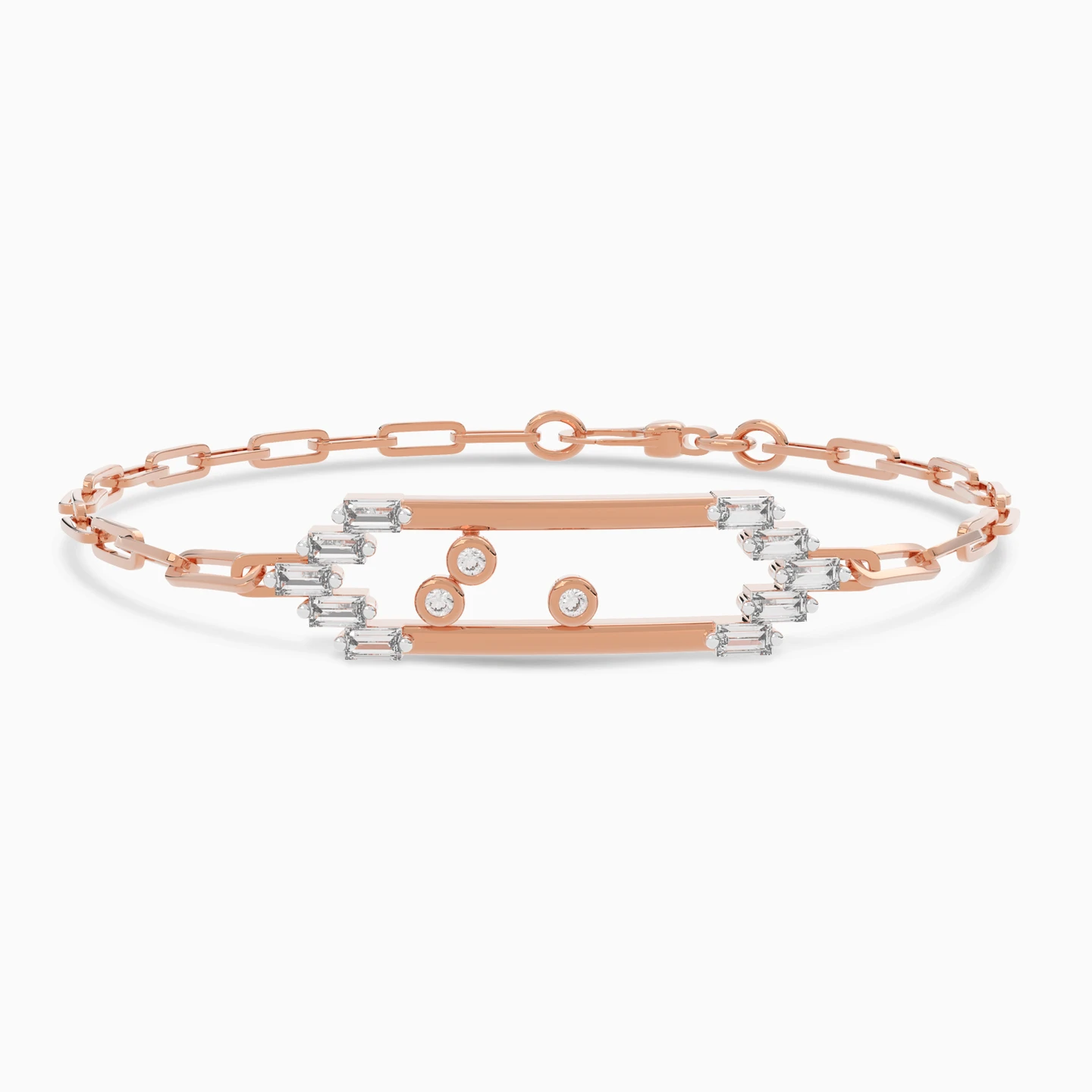 Sophisticated yet minimal, this 18k rose gold bracelet features a refined bar-shaped centerpiece adorned with diamonds and sleek geometric accents. The delicate chain and intricate details add a modern touch, making it an effortlessly stylish accessory for any occasion.