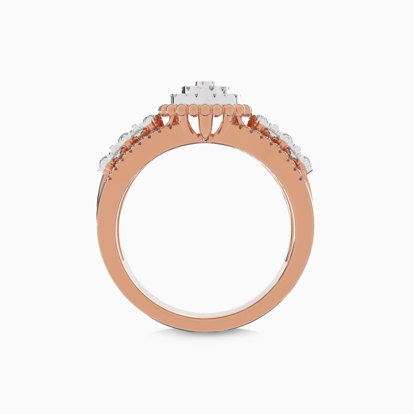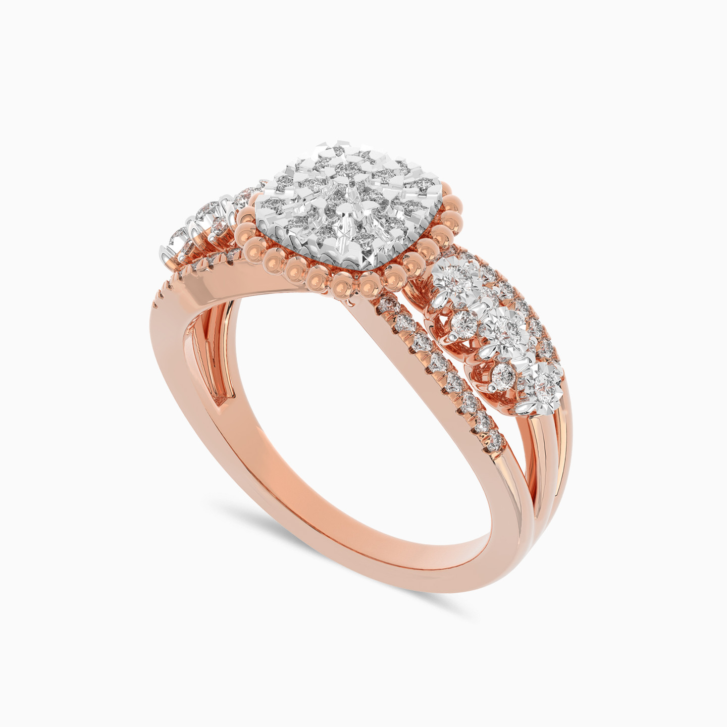 Elevate your look to luxury with this shiny piece from Lazurde Diamonds! This exquisite 18K rose gold statement ring features a central square adorned with sparkling diamonds, beautifully framed by diamonds on each side. The intricate design and radiant brilliance create a timeless masterpiece, making this ring the perfect choice for adding luxury and elegance to any occasion.