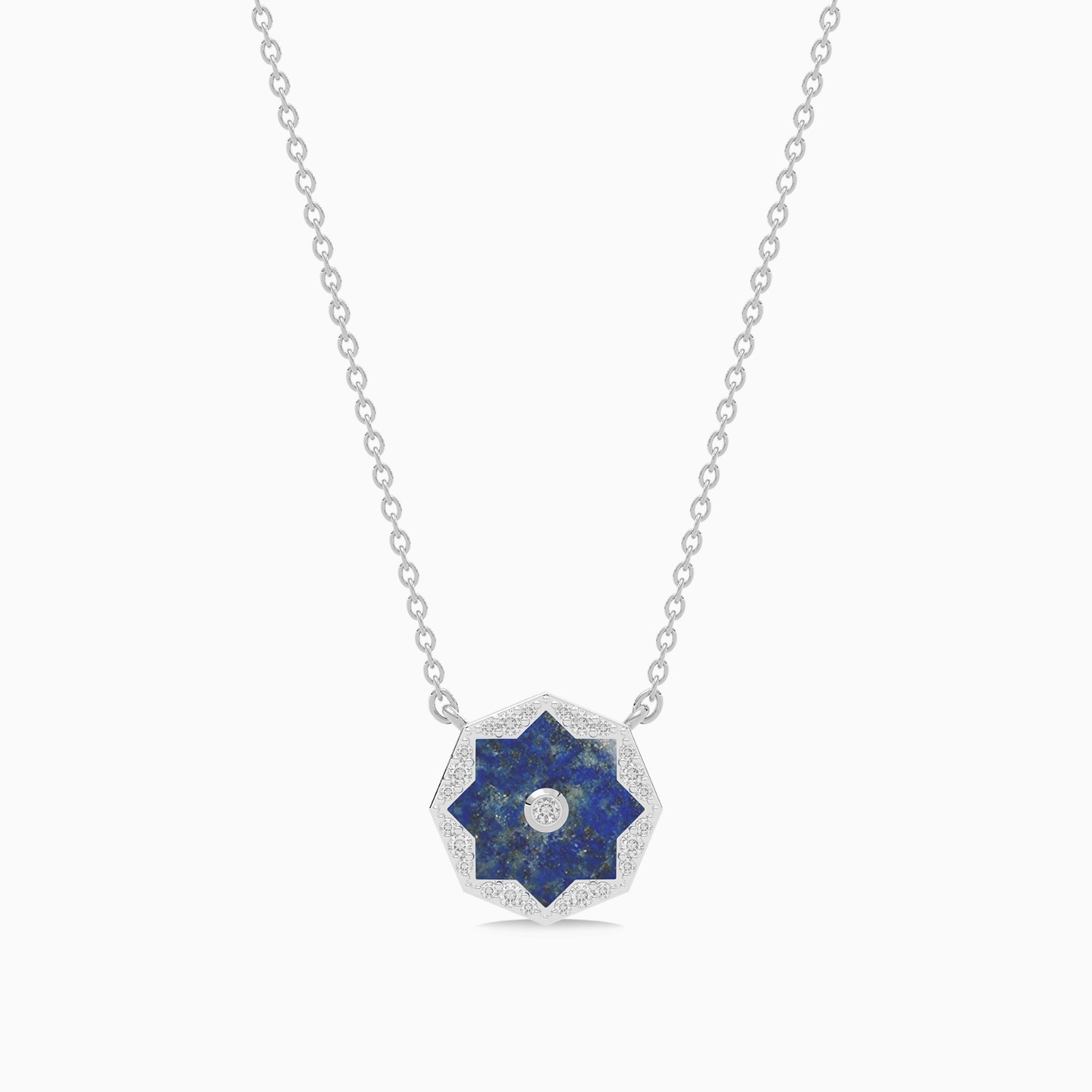Elevate your look to luxury with this shiny piece from Lazurde Diamonds! This elegant 18K white gold necklace features a captivating round pendant adorned with a deep blue star-like shaped stone, centered with a dazzling diamond. The minimal yet celestial-inspired design adds a touch of magic and brilliance, making it a timeless piece that complements any style. Whether worn alone or layered, this necklace is a symbol of elegance and sophistication, perfect for adding a stellar sparkle to your collection.