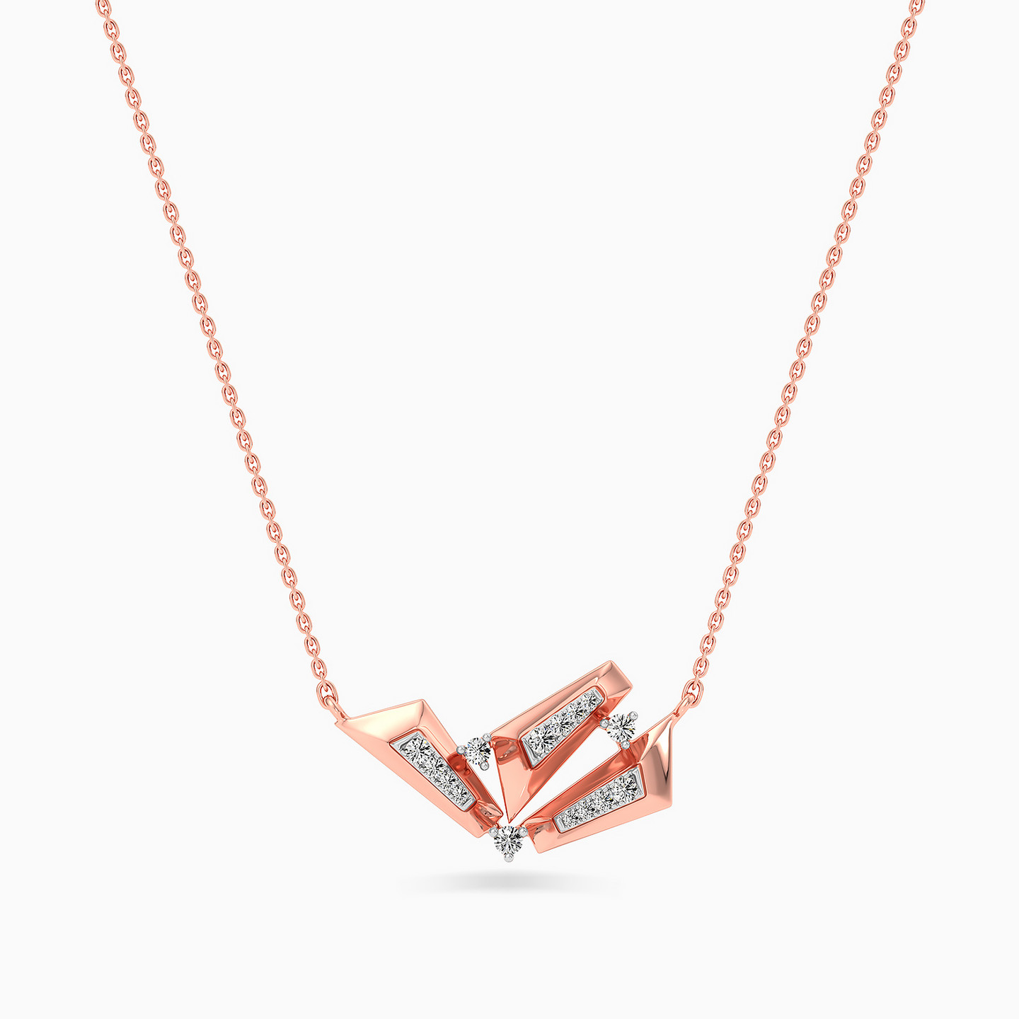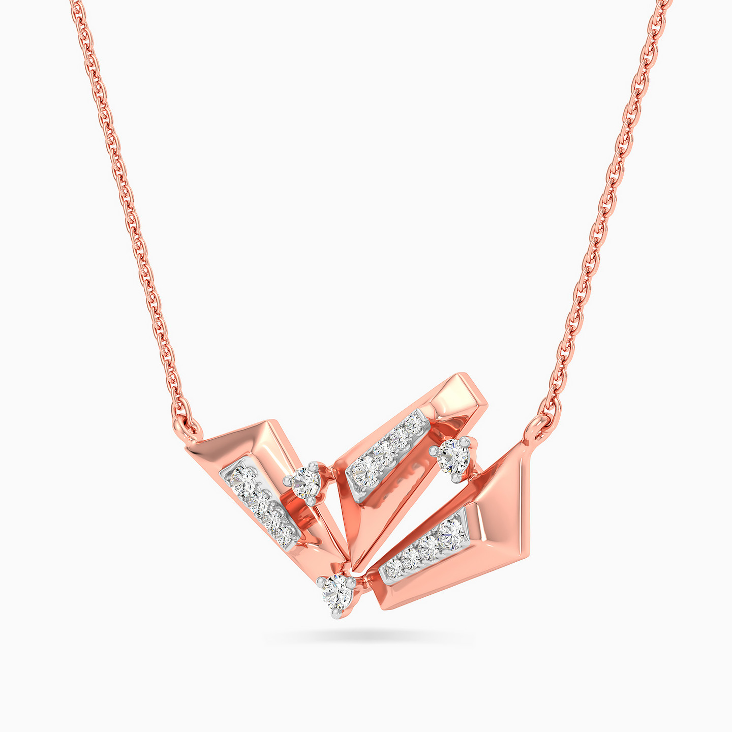 A captivating 18-karat rose gold pendant necklace from L'azurde Diamonds that is sure to make you dazzle like a diva! The centerpiece dazzles with a cluster of three abstract-shaped motifs, each boasting razor-sharp 3D edges and an array of brilliant cut diamonds in a mesmerizing channel setting right in the middle. Connected in opposite directions by single prong-set diamonds, this necklace is a testament to exquisite craftsmanship, sure to elevate any ensemble with its timeless allure.